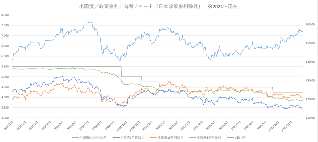 米国債(2、10年)、USD/JPY、政策金利 日足チャート(直近4年)