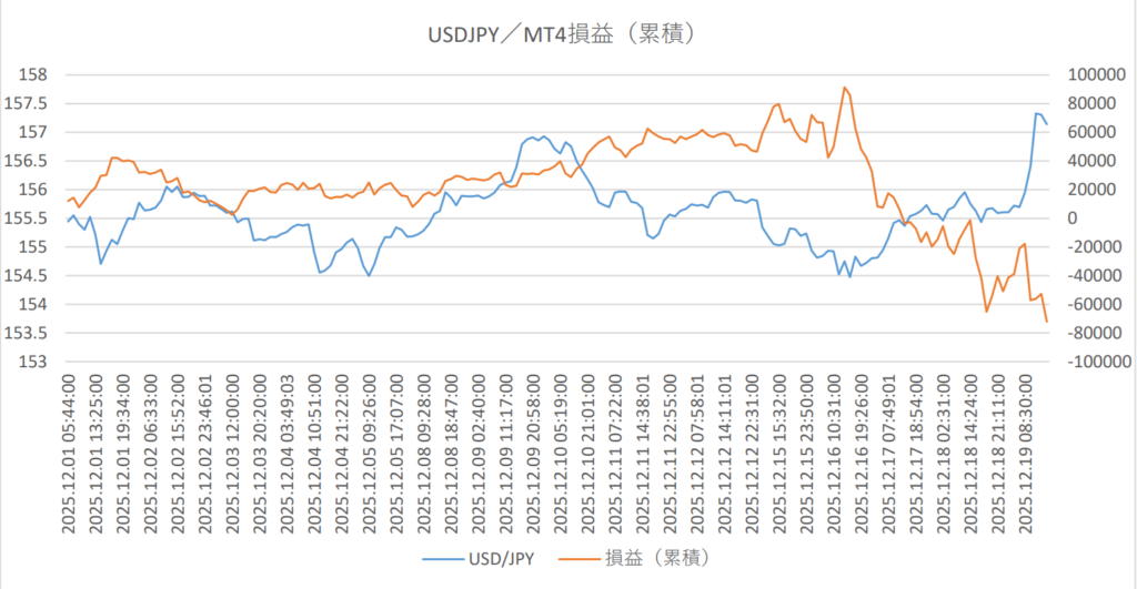 今週から導入EA_KK202512005が、初日は調子が良かったけど翌日から連敗を続ける結果に。水曜日にEA_KK202511051に戻したけれど、まぁそこまでロジックは変わらないので週末にかけて負け続けることに。ロットを2倍に増やしたこともあって累積はひどい結果となった。