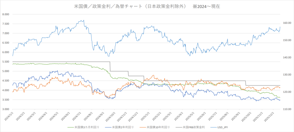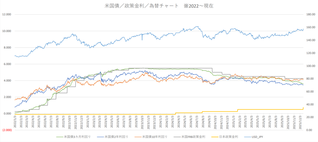 米国債(2、10年)、USD/JPY、政策金利 日足チャート(直近4年)