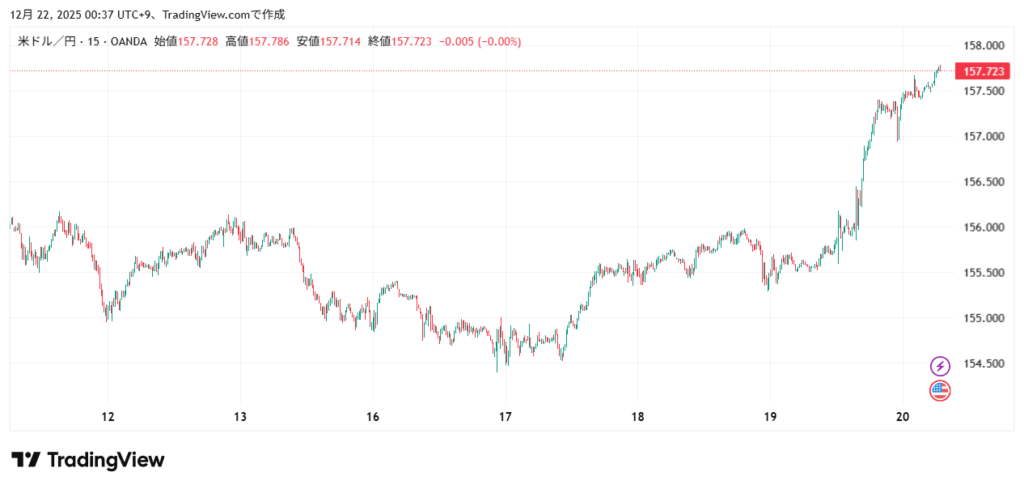 - 円売り加速し1カ月ぶり安値、日銀会合後に売り膨らむ-157円台半ば ※12/20 Bloomberg