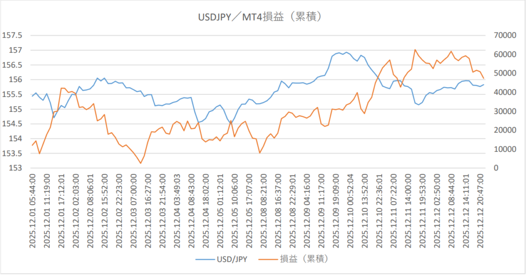 先週累積損益が不安定だったEA_KK202511051だけど、今週は比較的安定した成績だった。ただEAの改善も進めており、多少挙動を安定させたEA_KK202512005を来週から適用予定。また安定していないとはいえ累積で見るとマイナスに偏ることはなくなったため、口座残高増やして取引ロットを増やす予定。