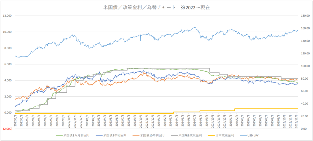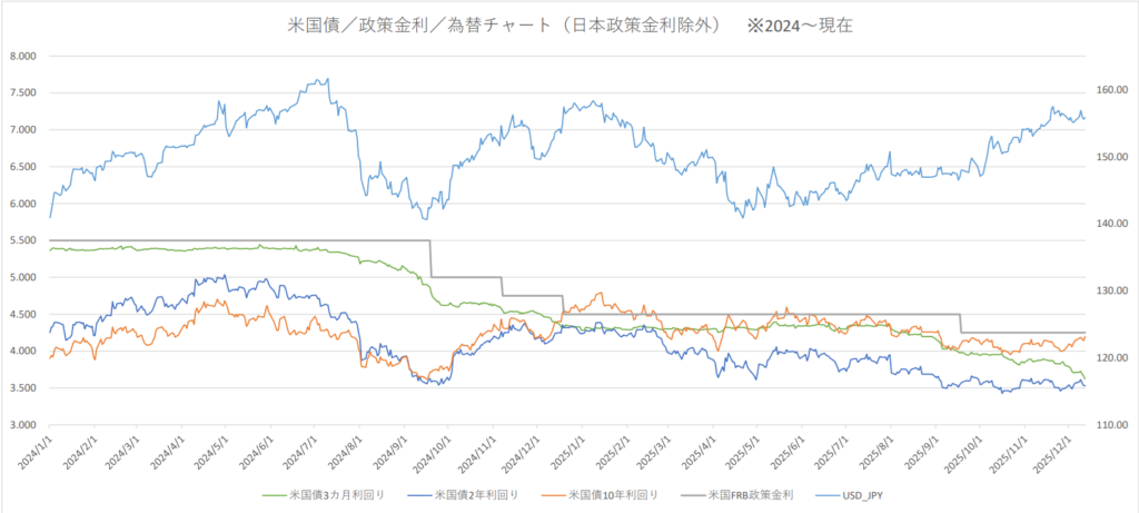 米国債(2、10年)、USD/JPY、政策金利 日足チャート(直近4年)