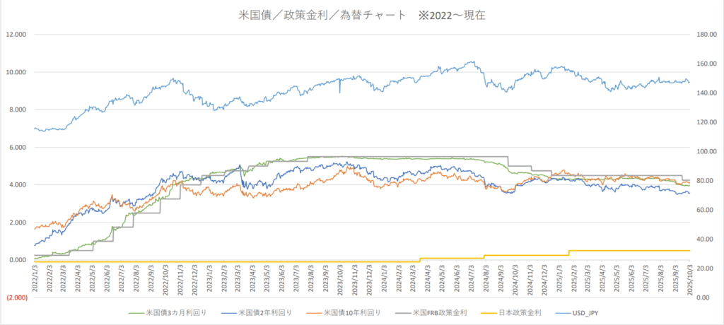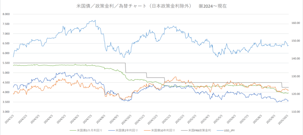 米国債(2、10年)、USD/JPY、政策金利 日足チャート(直近4年)