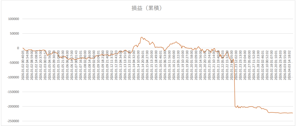 まだEAの開発を行っている最中。ふとMT5で一度もリアル口座で取引していなかったなと気づき、4/3の1日だけテストとしてEAをリアル口座へ適用して取引。予想どおりリアル取引とバックテストとで取引結果に乖離があり、現在原因を調査中。かなりシンプルな取引ロジックで試したんだけど、エントリのタイミングは一致したにもかかわらずクローズのタイミングが合わない。ロジック見ただけでは原因がわからないので、来週も1日だけ適用してログ出力してデバッグする予定。
